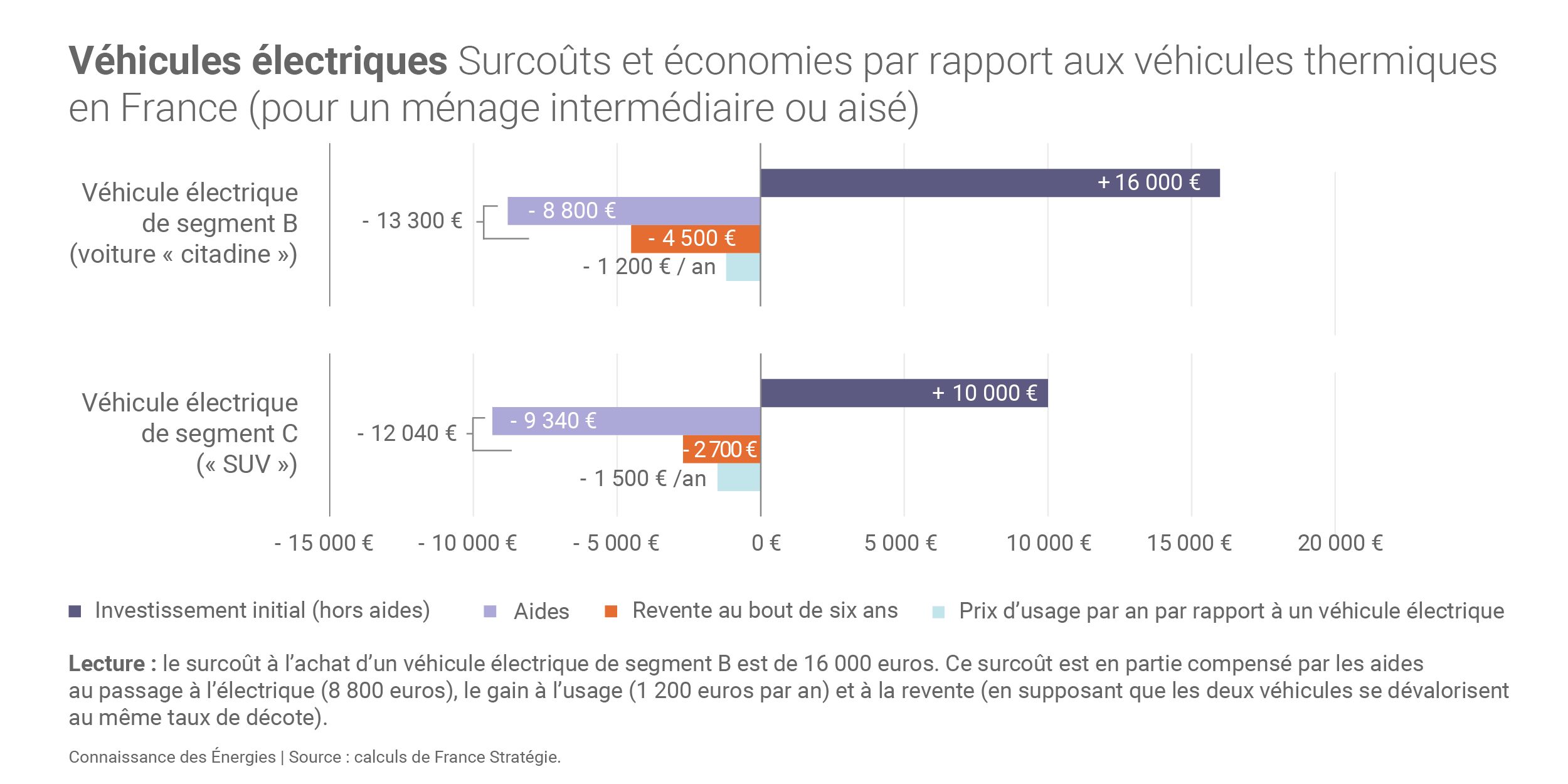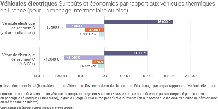 Pour acheter une voiture électrique de segment B dite « citadine », le surcoût par rapport à un modèle équivalent à moteur thermique est estimé en moyenne à 16 000 euros par France Stratégie. Avec les différentes aides (bonus écologique de 6 000 euros(1), taxe malus sur les émissions de CO2, prime à la conversion, etc.), ce surcoût peut être ramené à près de 7 200 euros.