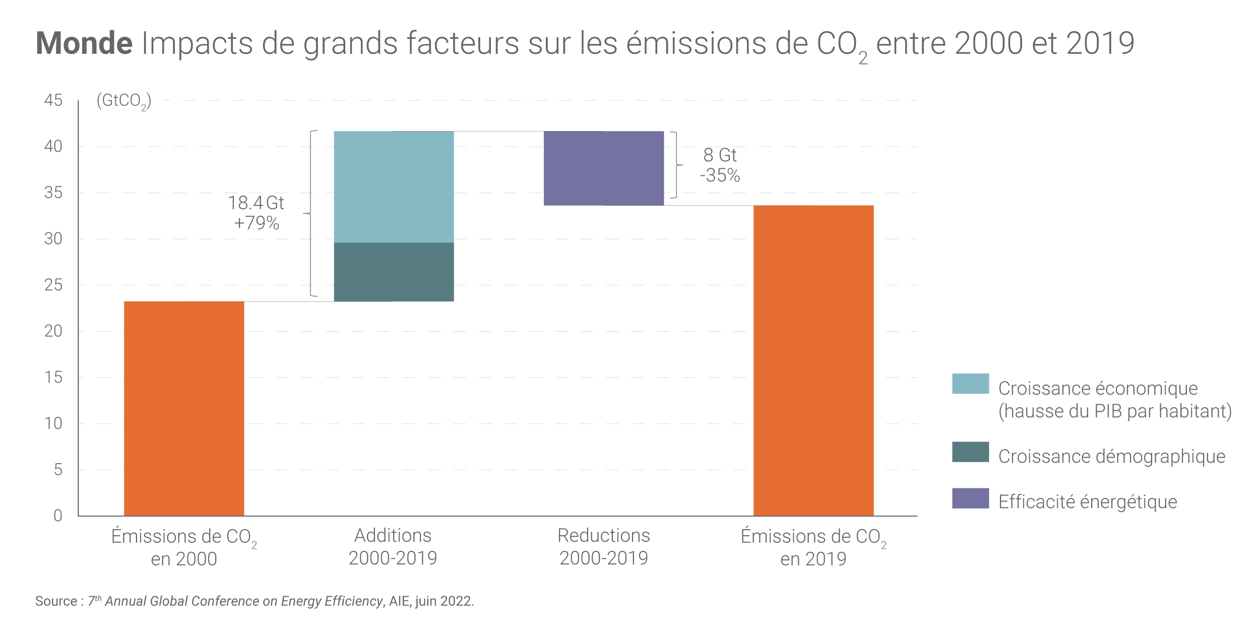 Par rapport à un scénario tendanciel (avec les politiques actuelles), un scénario de « haute efficacité énergétique » permettrait d’économiser près de 95 exajoules (EJ) en 2030, estime l'AIE, soit « l’équivalent de la consommation d’énergie finale annuelle de la Chine ». L’AIE envisage que ce scénario réduirait en particulier la consommation mondiale de pétrole de près de 30 millions de barils par jour (« soit environ le triple de la production moyenne de la Russie en 2021 ») et la consommation mondiale de gaz de 650 milliards de m3 par an (« soit environ 4 fois ce que l’UE a importé de Russie en 2021 »).