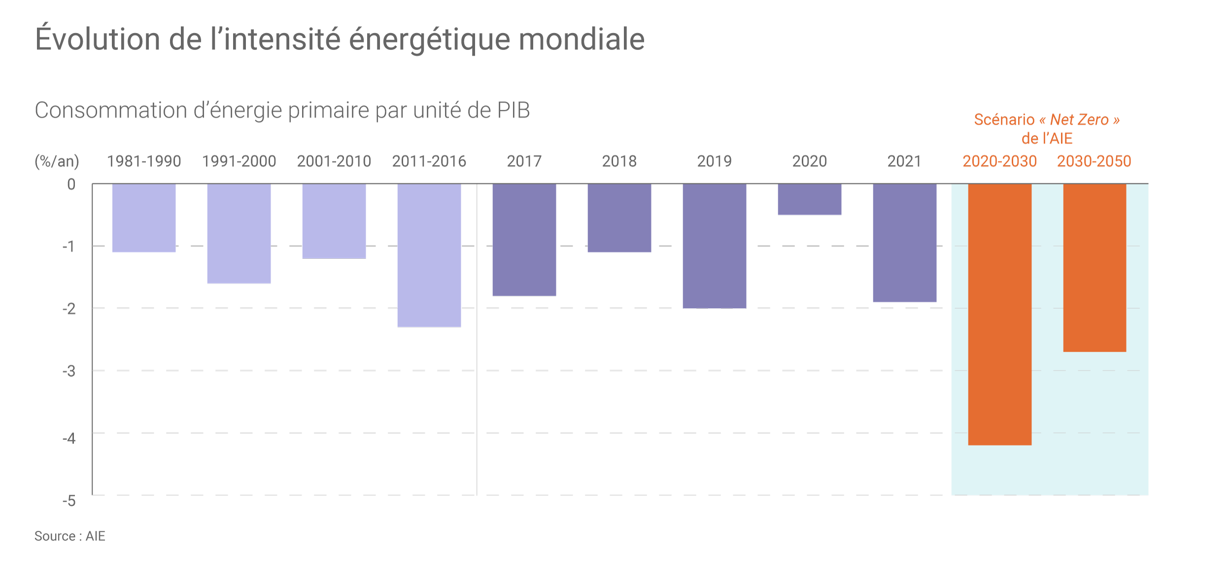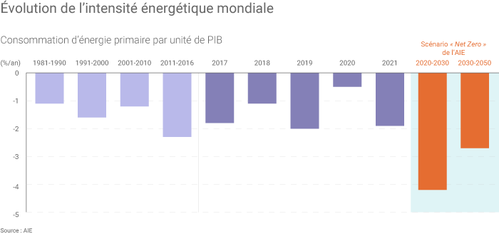 Selon l’AIE, il est nécessaire d’au moins « doubler les progrès d’intensité énergétique » pour espérer atteindre la neutralité carbone à l’horizon 2050 (scénario « NZE » de l’AIE), à savoir réduire de plus 4% par an cette intensité au niveau mondial d’ici à 2030.
