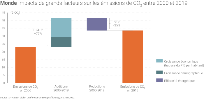 En 2021, les émissions mondiales de CO2 liées à l’énergie ont connu leur plus forte hausse annuelle pour atteindre près de 36 milliards de tonnes. Entre 2000 et 2019, ces émissions avaient déjà augmenté de près de 10 milliards de tonnes. Mais environ 8 milliards de tonnes de CO2 supplémentaires ont pu être évitées durant cette période grâce aux progrès d’efficacité énergétique, souligne l’AIE.