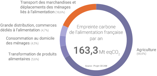 L’étude du projet CECAM évalue à 163 millions de tonnes équivalent CO2 les émissions annuelles de gaz à effet de serre associées à l’alimentation en France(5). Les deux tiers de cette « empreinte carbone » proviendraient de la production agricole, avec notamment d’importantes émissions de méthane issues « de la fermentation entérique par les ruminants et des effluents d’élevages » mais aussi de protoxyde d’azote (provenant principalement de la fabrication et de l’usage d’engrais azotés sur les sols). À ce titre, l’étude souligne que « la part carnée de notre alimentation mais aussi les pratiques agricoles sont déterminantes » dans l’empreinte carbone de l’alimentation française.