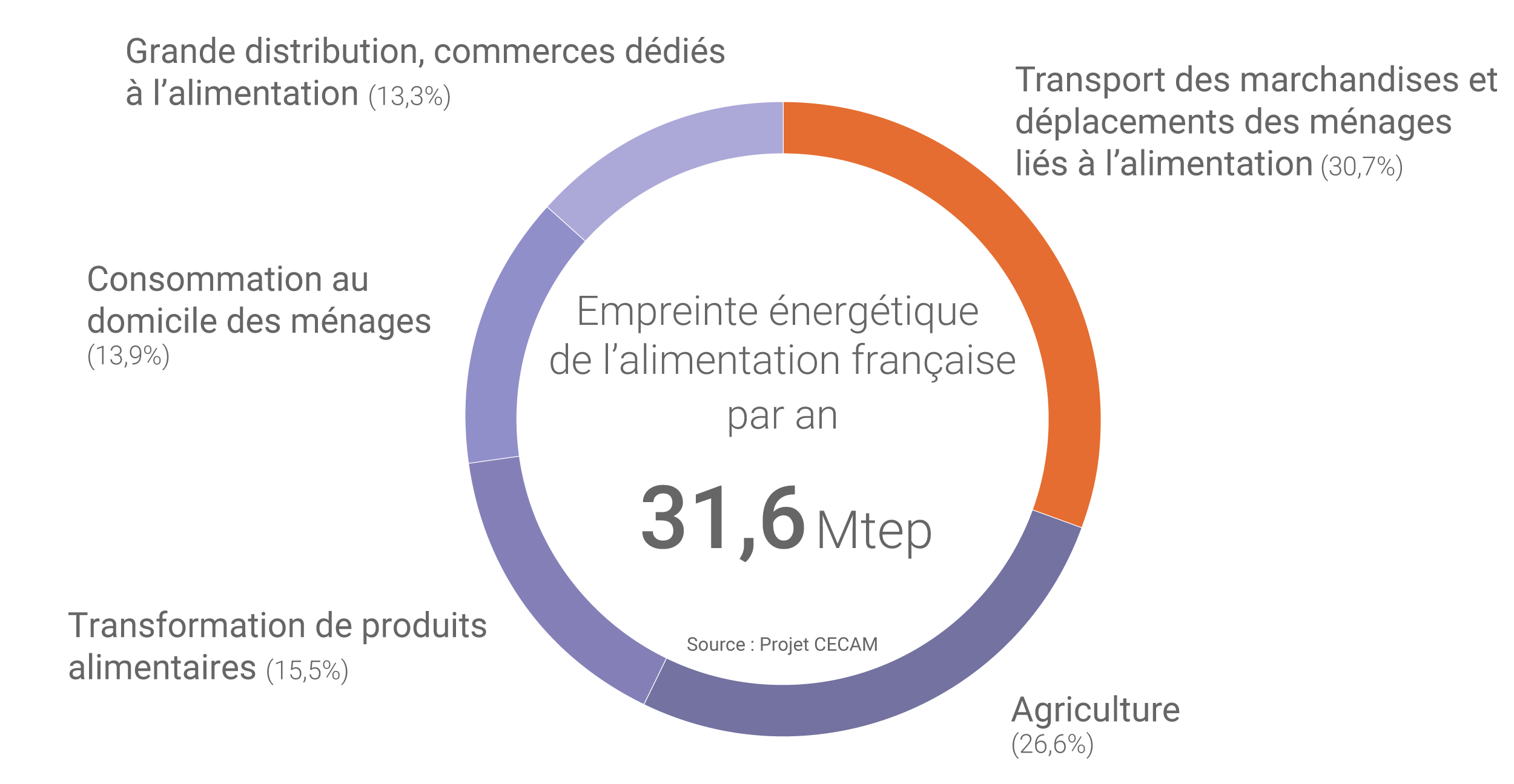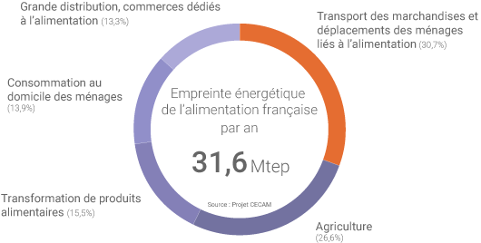 Au total, l’empreinte énergétique de l’alimentation en France s’élèverait à près de 31,6 Mtep par an selon le projet CECAM. Pour rappel, la consommation finale d'énergie de la France métropolitaine a atteint 141 Mtep en 2017 selon les dernières données ministérielles(3) (cette donnée ne prend pas en compte le contenu énergétique des biens importés).