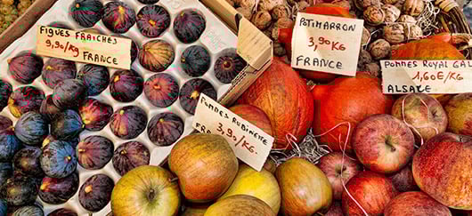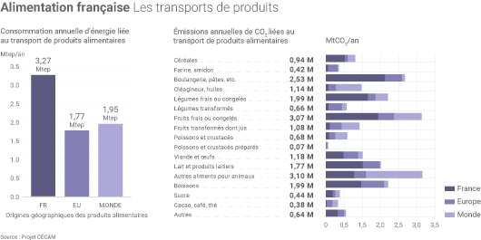 Pour estimer la consommation réelle d’énergie « du champ à l’assiette » (dite « empreinte » énergétique) associée à l’alimentation en France, il est nécessaire de prendre en considération le « contenu énergétique » des denrées importées et de déduire celui des denrées exportées, souligne l'étude du projet CECAM. Dans le cas des fruits (132 g consommés par jour par personne en moyenne), les pommes sont par exemple principalement produites en France métropolitaine mais la part de raisin importé atteint en revanche 74% des volumes commercialisés dans l’hexagone.