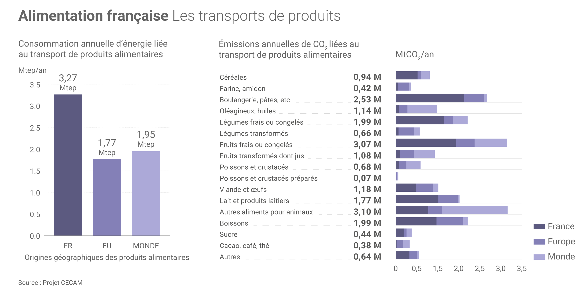 Près de 30,7% de l’empreinte énergétique de l’alimentation en France provient du poste « transports » (9,7 Mtep/an) selon l’étude du projet CECAM. La consommation d’énergie liée au transport des produits alimentaires s’élèverait à près de 7 Mtep par an et proviendrait pour plus de moitié des importations (principalement par voie maritime). Le projet CECAM prend également en compte la consommation d’énergie associée au déplacement des ménages « pour leurs achats alimentaires et la restauration hors domicile » (2,7 Mtep/ an). Il est estimé qu’une personne en France parcourt en moyenne 1 360 km par an à cette fin(4).