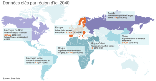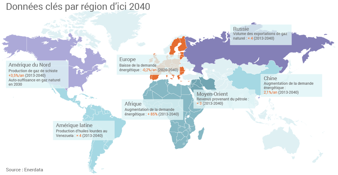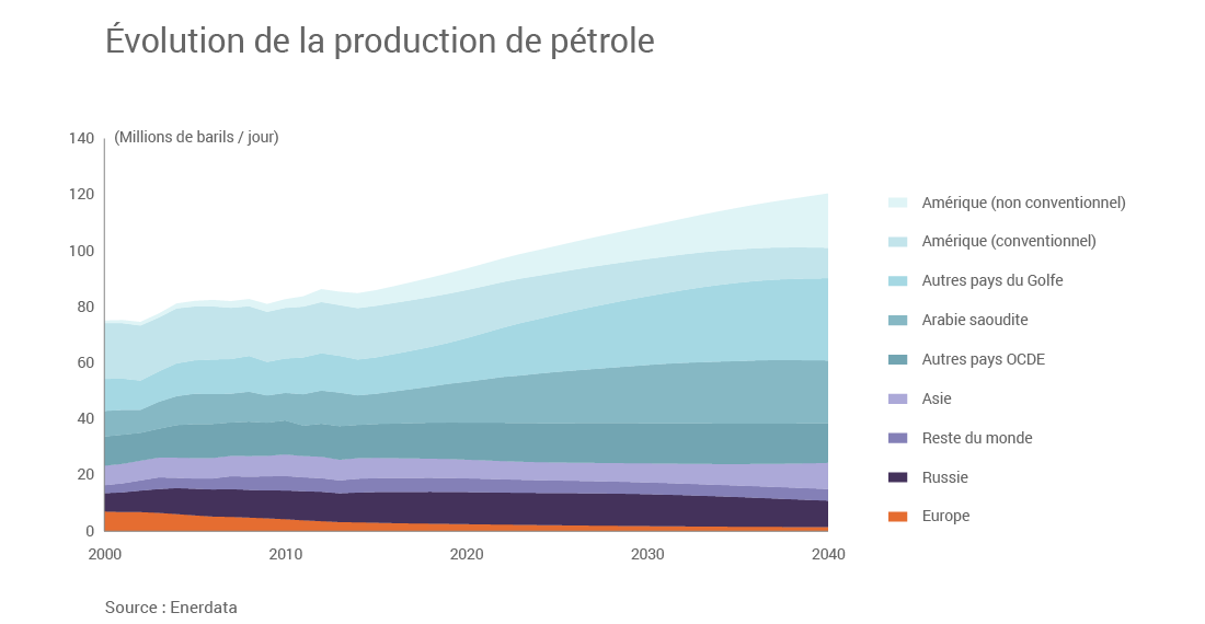 Selon Enerdata, le développement du pétrole non conventionnel, en particulier des huiles de schiste, se poursuivra outre-Atlantique jusqu’à dépasser la production de pétrole dit « conventionnel » sur le continent américain après 2030. L’Arabie saoudite devrait toutefois également fortement augmenter sa production et rester à cet horizon le premier producteur mondial de brut. Malgré la croissance de la production nord-américaine, l’OPEP devrait jouer un rôle crucial dans l’approvisionnement mondial : elle pourrait fournir 55% de la production mondiale en 2040 (contre près de 42% en 2013).