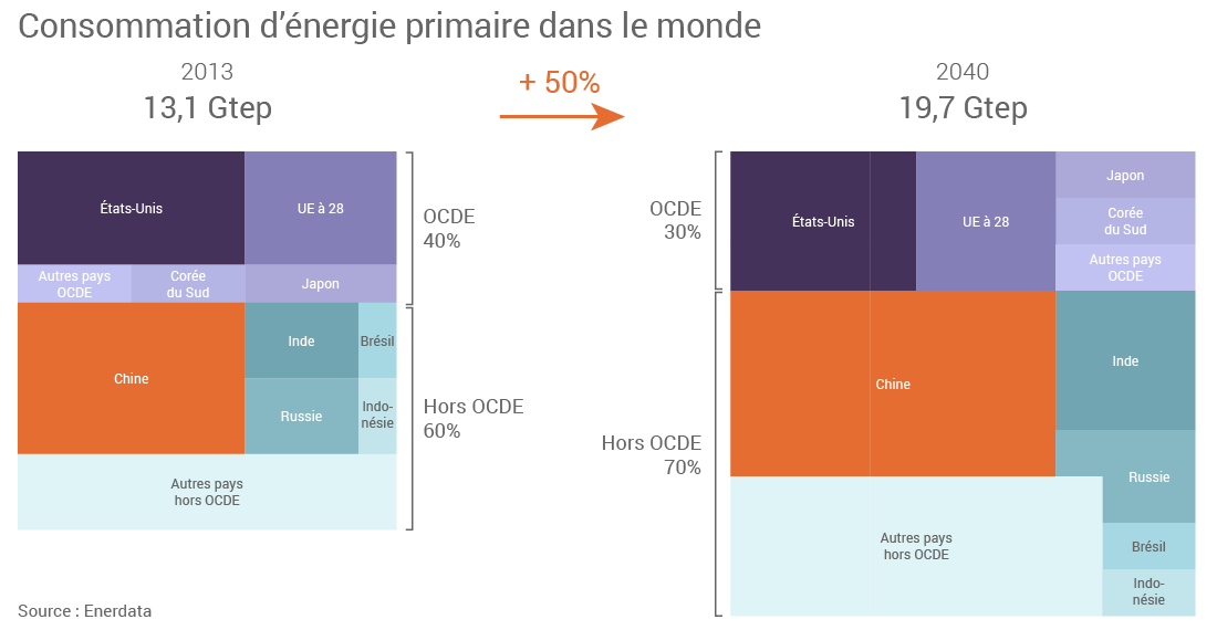 Comme le BP Energy Outlook (+37% entre 2013 et 2035), Enerdata prévoit que la consommation d’énergie dans le monde va fortement croître d’ici à 2040, principalement dans les pays n’appartenant pas à l’OCDE (+94% entre 2010 et 2040), notamment la Chine. Ces pays vont toutefois diviser par 2 leur intensité énergétique entre 2010 et 2040 selon Enerdata, ce qui limitera la hausse de la demande mondiale.