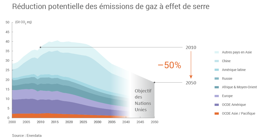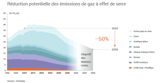 Selon BP, les émissions mondiales de gaz à effet de serre liées à la consommation d’énergie devraient encore augmenter de 25% entre 2013 et 2035. Enerdata a pour sa part cherché à voir l’effort de réduction nécessaire pour atteindre les objectifs de l’ONU et maintenir le réchauffement climatique en dessous de 2°C d’ici à la fin du siècle (par rapport au début de l’ère industrielle). Le cabinet estime que près de 70% de la réduction des émissions de gaz à effet de serre devraient provenir des pays hors OCDE, en particulier de la Chine, 1er émetteur mondial.