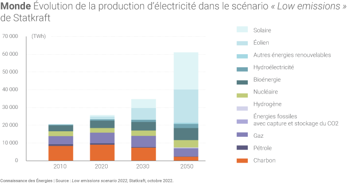 Dans son scénario Low Emissions, Statkraft estime que les énergies renouvelables dans leur ensemble vont compter pour quasiment 80% de la production mondiale d'électricité en 2050. Et que la production solaire à cet horizon (plus de 21 000 TWh en 2050) « équivaudra à 80% de la demande d'électricité à l'heure actuelle ».