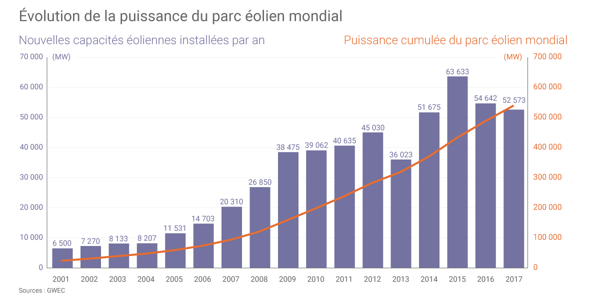 Au niveau mondial, les capacités éoliennes installées en 2017 se sont élevées à 52,6 GW, soit une baisse d’environ 4% par rapport à 2016 selon le GWEC (Global Wind Energy Council). Ce léger recul reflète, selon le secrétaire général du GWEC Steve Sawyer une plus grande maturité de la filière, « en transition vers un système basé sur le marché » et en compétition avec d’autres technologies (désormais) plus subventionnées.