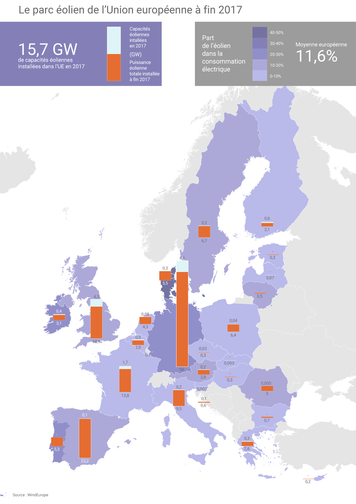 Le parc éolien de l’UE, dont la puissance cumulée a dépassé 169 GW à fin 2017, a produit 336 TWh en 2017, soit l’équivalent de « 11,6% de la demande électrique moyenne de l’UE » selon WinEurope. Au Danemark, la production éolienne de 2017 équivaudrait même à 44% de la demande électrique nationale (cette production n’intervenant toutefois pas nécessairement aux heures de consommation).