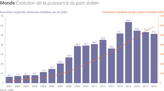 Au niveau mondial, près de 51,3 GW de nouvelles capacités éoliennes ont été installées en 2018 (plus de 91% d’installations terrestres) selon les dernières données du Global Wind Energy Council (GWEC) qui doit remettre son rapport définitif le 3 avril prochain. Le volume de ces nouvelles installations est inférieur de 3,6% à celui de 2017 mais GWEC souligne l’émergence de nouveaux marchés comme l’Amérique latine, l’Asie du Sud-Est et l’Afrique (avec toutefois seulement 10% des capacités installées en 2018).