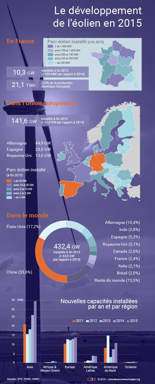 Les chiffres clés du développement de l'éolien en 2015 (©Connaissance des Énergies)
