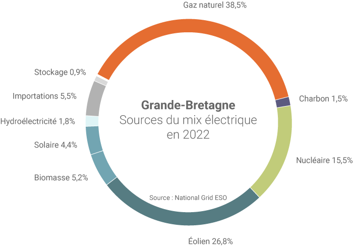 C'est toutefois bien le gaz naturel qui a toutefois encore fourni le plus d'électricité à la Grande-Bretagne en 2022 (38,5%) devant l'éolien (26,8%) et le nucléaire (15,5%).