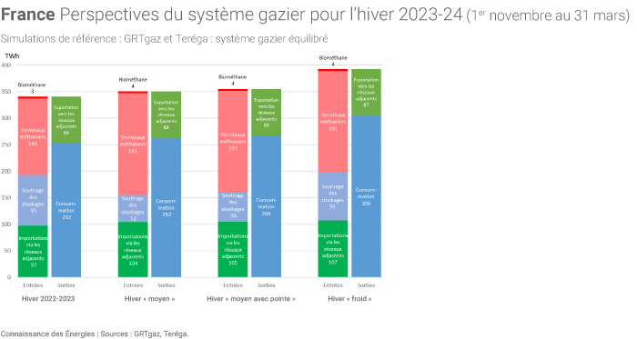 - des importations « soutenues » de GNL via les terminaux méthaniers, renforcés par la mise en service à venir d'un terminal flottant (FRSU) au Havre (« d'une capacité d’environ 22 TWh durant l’hiver gazier, soit une augmentation de 12% des capacités françaises de regazéification »)(1) ;
