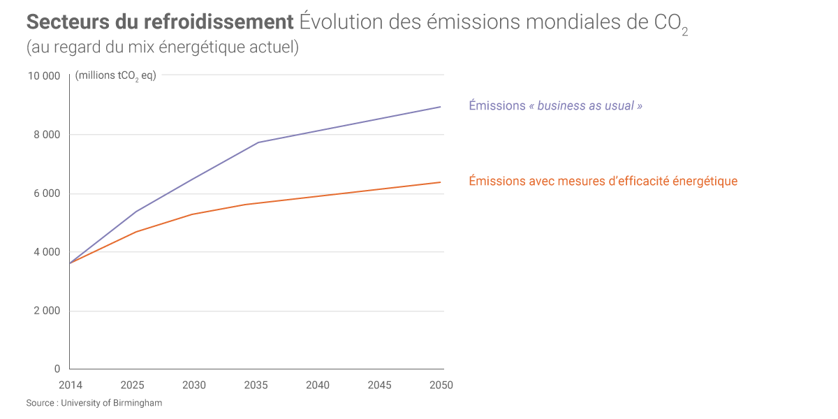A mix de production inchangé, les besoins mondiaux d’énergie liés au refroidissement pourraient engendrer des émissions supplémentaires de 2,5 milliards de tonnes d'équivalent CO2 par an à l’horizon 2050.