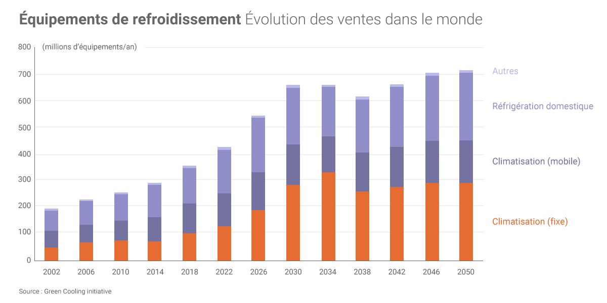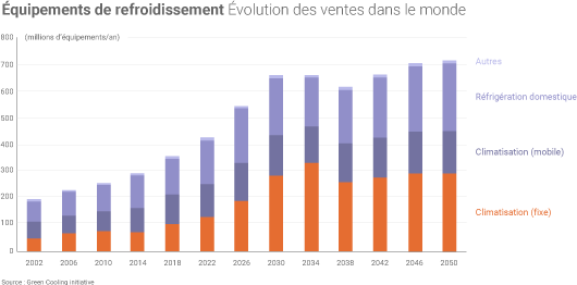 En 2017, le monde a consommé près de 3 900 TWh d'énergie à des fins de refroidissement (climatisation dans les logements et bureaux, réfrigération d’aliments et de médicaments, etc.), soit près de 3% à 4% de la consommation finale d'énergie selon Toby Peters, professeur à l’Université de Birmingham. D'après ses estimations, le secteur du refroidissement pourrait absorber 7 500 TWh en 2050, soit « 6,4% à 10% de la consommation globale d'énergie » à cet horizon, et ce malgré l'amélioration de l'efficacité énergétique des équipements associés.
