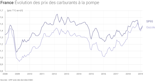 Le prix des carburants à la pompe et la fiscalité pesant sur ces produits ont été au cœur du mouvement des « gilets jaunes ». Au 22 mars 2019, les taxes constituent respectivement 58,2% du prix du gazole à la pompe (0,85 €/l sur un prix total de 1,46 €/l) et 62,7% du prix du SP95 dont s’acquittent les automobilistes (0,94 €/l sur un prix total de 1,5 €/l).