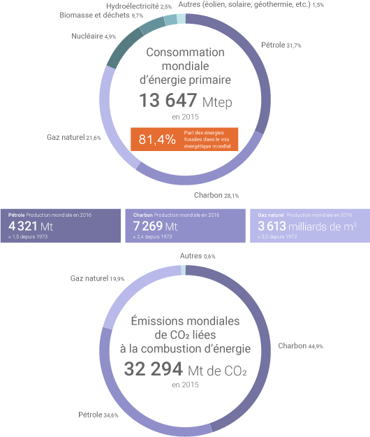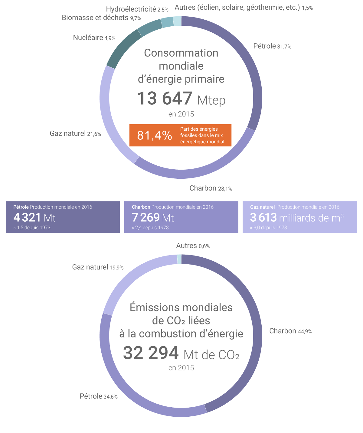 La consommation mondiale d'énergie primaire a encore reposé à 81,4% sur les énergies fossiles en 2015 selon les dernières données de l’AIE. En 1973, cette part atteignait 86,7% (dont 46,2% pour le seul pétrole) et les énergies décarbonées ont ainsi légèrement progressé dans le mix énergétique mondial.