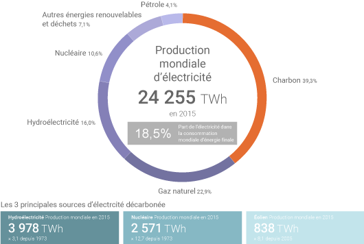 L’électricité a compté pour 18,5% de la consommation finale d’énergie dans le monde en 2015 (contre 9,4% en 1973). Le mix de la production électrique mondiale reste encore largement dominé par le charbon (39,3% de la production mondiale en 2015), pourtant montré du doigt pour les fortes émissions de gaz à effet de serre associées à sa combustion.