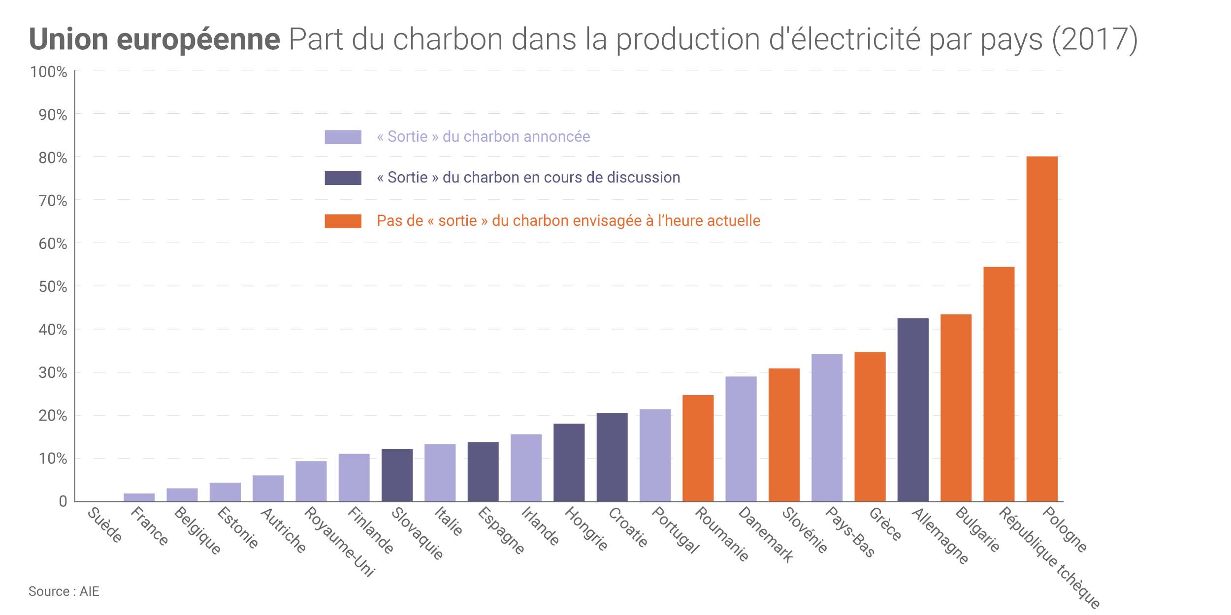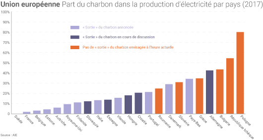 Au sein même de l’Union européenne, l’AIE souligne les différences entre les pays d’Europe de l’Ouest qui développent des politiques de « sortie » du charbon (en discussion dans le cas de l'Allemagne) et ceux d’Europe de l’Est où ce combustible joue encore un rôle majeur, notamment dans la production électrique (Pologne et République tchèque en tête).