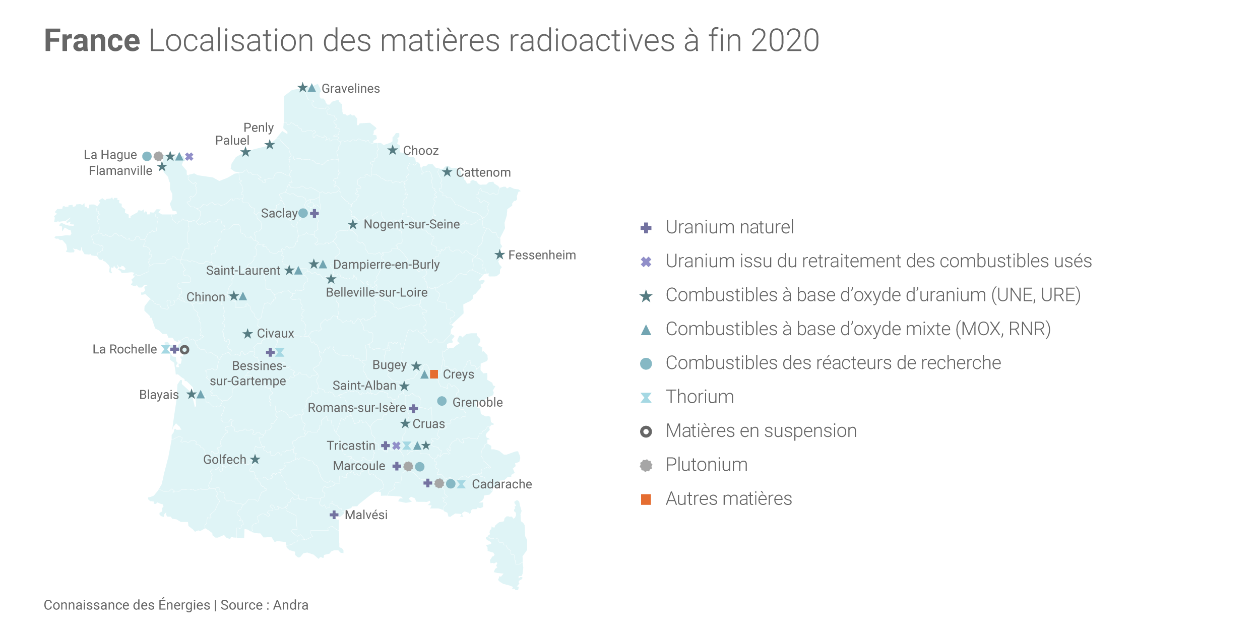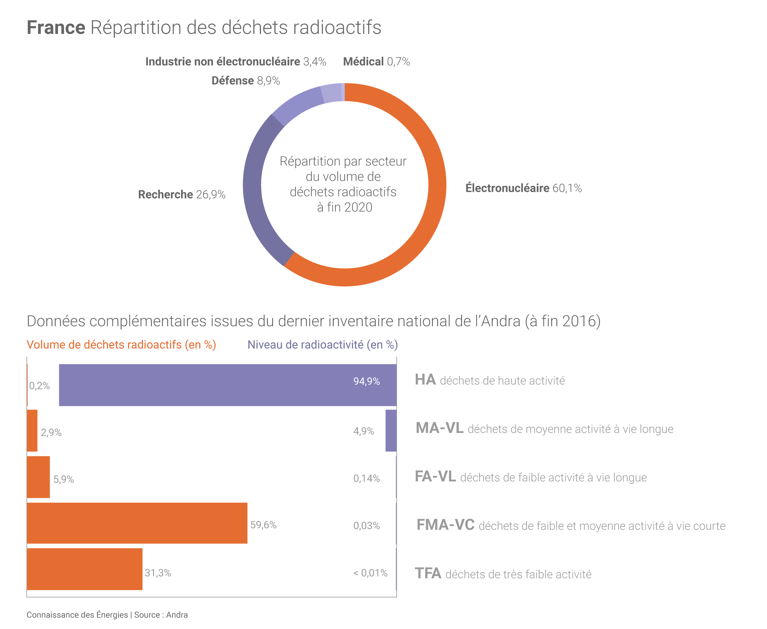 À fin 2020, près de 1,7 milliard de m3 de déchets radioactifs étaient « pris en charge par l’Andra ou destinés à l’être » sur le territoire français. Ces déchets proviennent à 60,1% de la production électrique du parc nucléaire français et à 26,9% d’activités de recherche (le reste provenant de la défense, d’autres industries comme l’extraction de terres rares et du secteur médical).