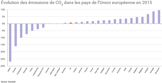 Seuls quelques pays ont vu leurs émissions baisser parmi lesquels Malte (- 26,9%), l’Estonie (- 16%) et le Danemark (- 9,9%). A Malte, la mise en place d'une interconnexion électrique avec l'Italie en mars 2015 a permis au pays de réduire drastiquement la production d'électricité à partir de produits pétroliers (Malte importe désormais 65% de son électricité de l'Italie). Le Danemark a pour sa part pu notamment baisser ses émissions grâce à l’augmentation de sa production éolienne (+ 8%) indique Carole Mathieu mais aussi grâce à la hausse de ses importations d’électricité depuis la Norvège et la Suède (les émissions sont ainsi comptabilisées dans ces pays)(3).