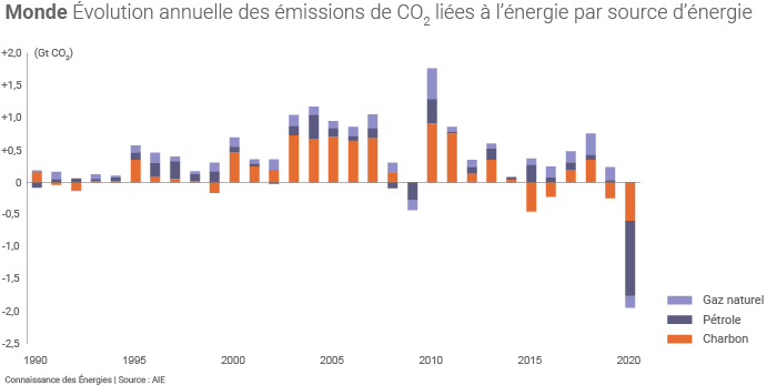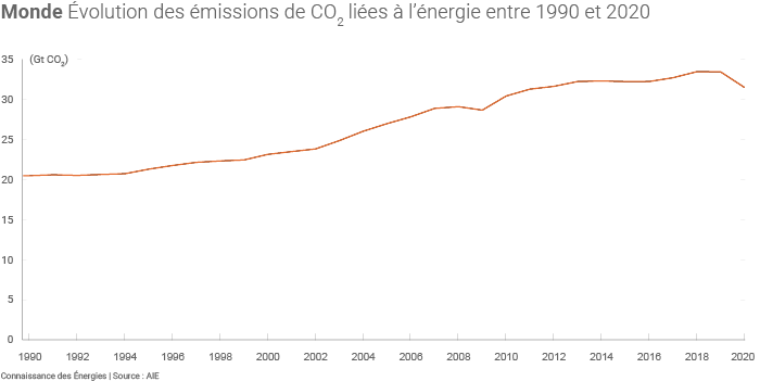 En 2020, les émissions mondiales de CO2 liées à l’énergie ont atteint 31,5 milliards de tonnes (Gt) selon les dernières estimations de l’AIE, soit une baisse d’environ 5,8% par rapport à 2019 (33,4 Gt CO2), « la plus forte chute annuelle […] depuis la Seconde Guerre mondiale ».