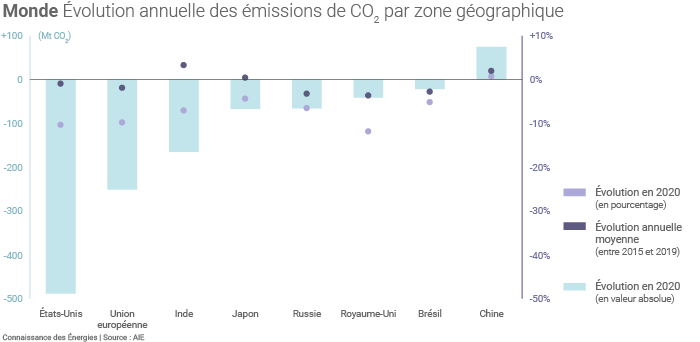 - l’évolution des émissions varie selon les zones géographiques : en Chine, les émissions de CO2 liées à l’énergie ont ainsi augmenté de 0,8% en 2020 (+ 75 millions de tonnes) par rapport à 2019 grâce à une « sortie » précoce de la pandémie et une reprise de l’activité économique (les émissions chinoises ont rebondi dès le mois d’avril 2020 et étaient, en décembre 2020, supérieures de 7% au niveau de décembre 2019 selon l’AIE). Les États-Unis ont au contraire vu leurs émissions chuter de 10% en 2020, tout comme l’Union européenne, dont les États membres ont connu différentes périodes de confinement.