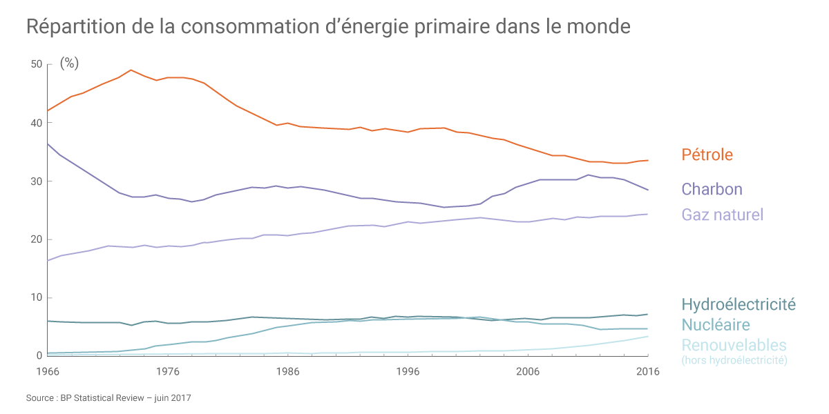 Les énergies fossiles ont encore satisfait 85,5% de la consommation mondiale d’énergie primaire en 2016 (86% en 2015). Près d’un tiers de cette consommation mondiale est couverte par le pétrole, dont la demande a augmenté de 1,6 million de barils par jour (Mb/j) en 2016, notamment sous l’effet de la baisse des cours. Le charbon reste la deuxième énergie la plus consommée (28,1% du mix) mais sa part recule au profit du gaz naturel (24,1%)(2).