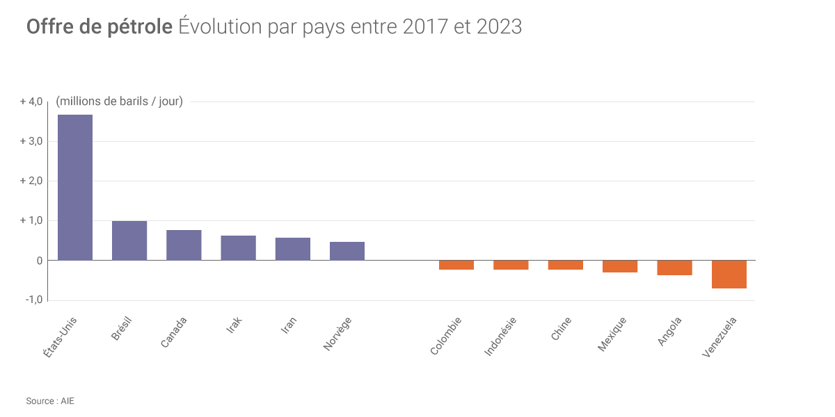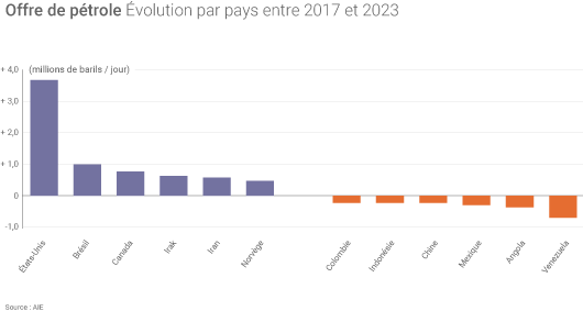 La hausse de la production pétrolière aux États-Unis, au Brésil, au Canada et en Norvège pourrait plus que satisfaire la hausse de la demande mondiale d’ici à 2023. (©Connaissance des Énergies, d’après AIE)