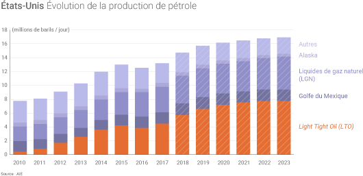 « Si l’on tient compte des liquides associés à la production de gaz naturel (LGN), le total de la production américaine se situerait à 14,8 Mb/j », soit bien plus que l’Arabie saoudite (11,9 Mb/j) ou la Russie (11,3 Mb/j), précise Guy Maisonnier, ingénieur économiste à IFP Énergies nouvelles. Il convient toutefois de rappeler selon lui que « cette compétition n’en est pas une », sachant que l’Arabie saoudite et la Russie limitent leurs productions respectives.