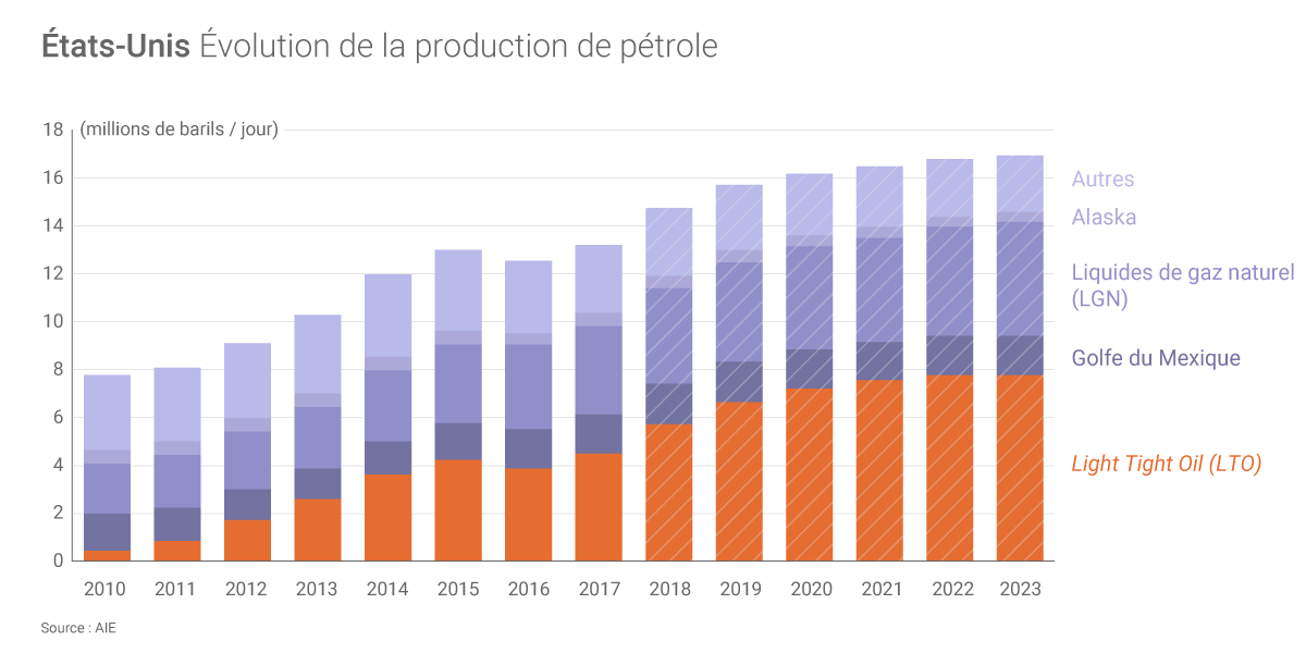 « Si l’on tient compte des liquides associés à la production de gaz naturel (LGN), le total de la production américaine se situerait à 14,8 Mb/j », soit bien plus que l’Arabie saoudite (11,9 Mb/j) ou la Russie (11,3 Mb/j), précise Guy Maisonnier, ingénieur économiste à IFP Énergies nouvelles. Il convient toutefois de rappeler selon lui que « cette compétition n’en est pas une », sachant que l’Arabie saoudite et la Russie limitent leurs productions respectives.