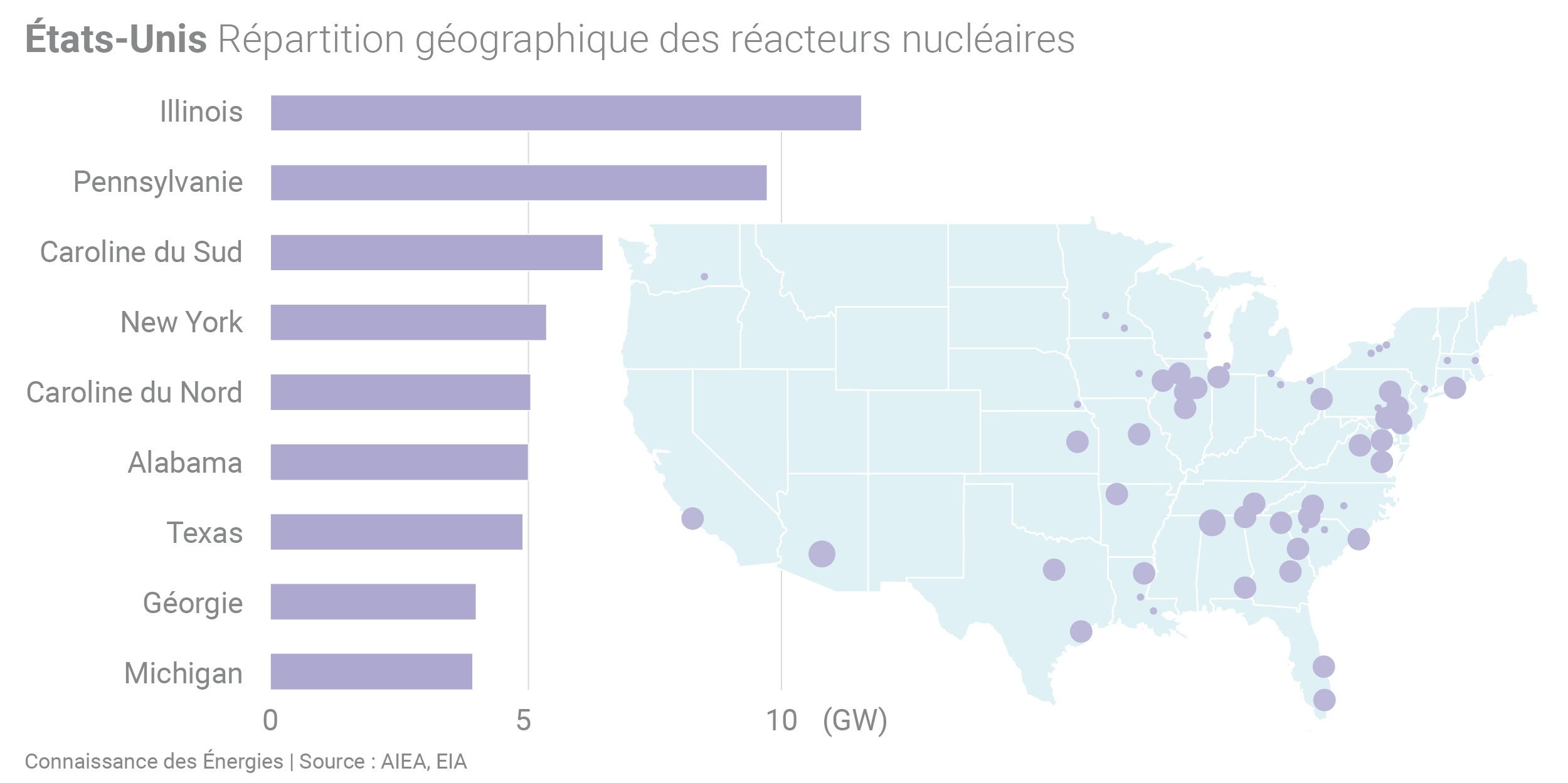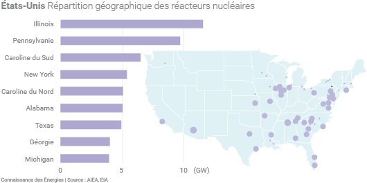 Les États-Unis disposent actuellement du plus grand parc nucléaire au monde, avec 97 réacteurs « fonctionnels » répartis entre 58 centrales (d’une puissance cumulée de 98,4 GW). En 2018, l’énergie nucléaire a compté pour 19,3% de la production américaine d’électricité (contre 71,7% en France métropolitaine).