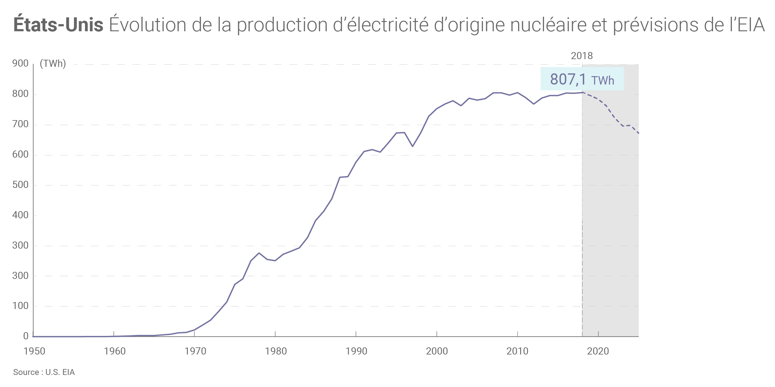 Selon les projections de l’EIA, la production du parc nucléaire américain pourrait baisser de 17% en 2025(8) par rapport au niveau de 2018. Cette perte de production sera « largement compensée par (la hausse de production) des nouvelles centrales au gaz naturel, éoliennes et solaires » selon l’agence américaine.