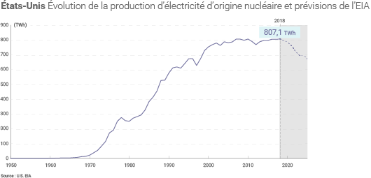 Selon les projections de l’EIA, la production du parc nucléaire américain pourrait baisser de 17% en 2025(8) par rapport au niveau de 2018. Cette perte de production sera « largement compensée par (la hausse de production) des nouvelles centrales au gaz naturel, éoliennes et solaires » selon l’agence américaine.