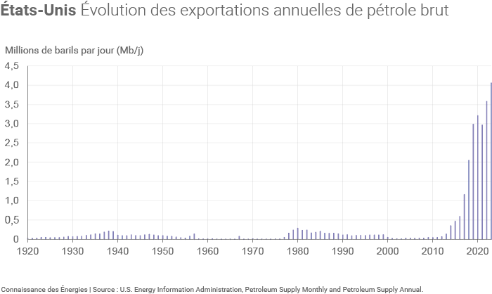 En 2023, les exportations américaines de pétrole brut se sont élevées en moyenne à 4,1 millions de barils par jour (Mb/j), soit 13% de plus qu'en 2022, déjà une année record. « Depuis la levée de l'interdiction d'exportation du pétrole brut en 2015, nous avons observé une augmentation remarquable, passant de quasiment rien à près de 5 millions de barils par jour à l'heure actuelle », confirme Jérôme Sabathier, chef du département Économie et évaluation environnementale chez IFP Energies nouvelles.