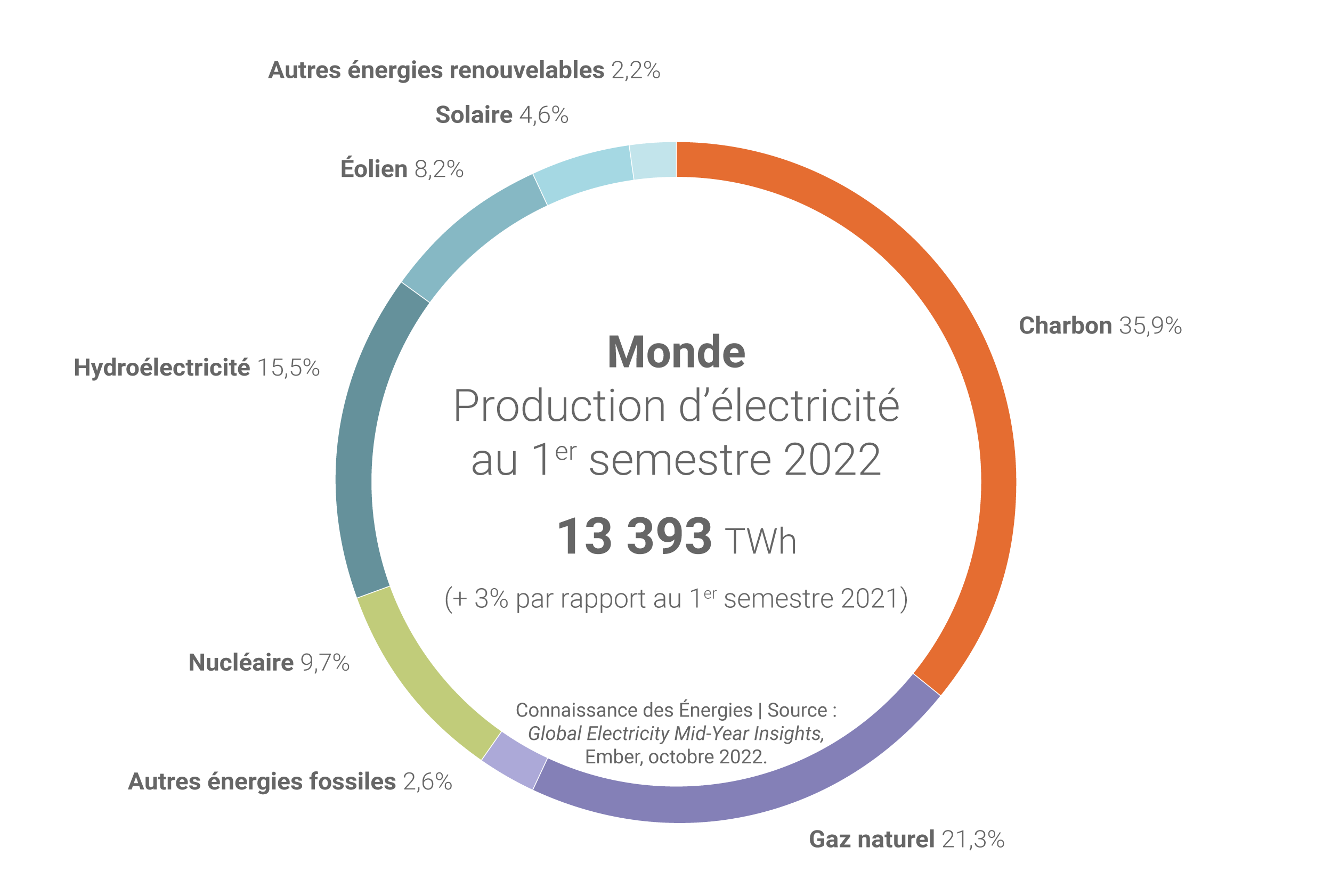 Mais la majorité de la production d'électricité dans le monde reste toujours assurée par les énergies fossiles (59,8% au 1er semestre 2022).