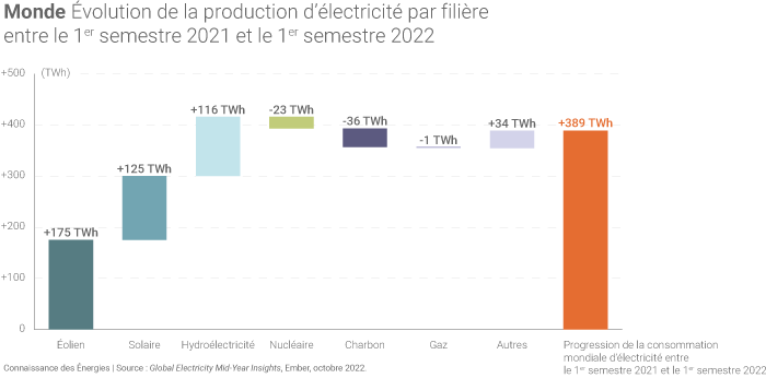 La production mondiale d'électricité des principales filières renouvelables (dans son rapport, Ember comptabilise sous le terme « renouvelables » les données des 3 principales filières « EnR » productrices d'électricité : hydroélectricité, éolien et solaire) a augmenté de 416 TWh entre le 1er semestre 2021 et le 1er semestre 2022, soit davantage que la hausse de la demande totale d'électricité durant cette période (389 TWh), souligne Ember.