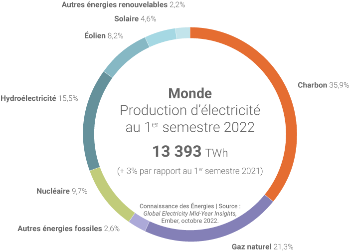 Mais la majorité de la production d'électricité dans le monde reste toujours assurée par les énergies fossiles (59,8% au 1er semestre 2022).