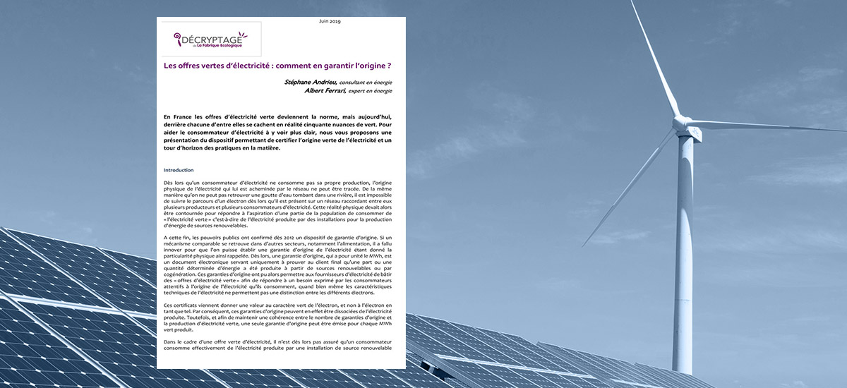Entre 2014 et 2018, le nombre de fournisseurs d’énergie proposant aux consommateurs français des offres d’électricité dite « verte » (à partir de sources renouvelables) a triplé (de 10 à 30)(1) selon la Fabrique Écologique(2). Cette promesse d’une fourniture d’électricité « verte » se heurte à une contrainte majeure : « de la même manière qu’on ne peut pas retrouver une goutte d’eau tombant dans une rivière, il est impossible de suivre le parcours d’un électron dès lors qu’il est présent sur un réseau raccordant entre eux plusieurs producteurs et plusieurs consommateurs d’électricité ».