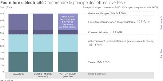 • dans le cadre d’une offre verte « standard », le fournisseur achète de l’électricité sur le marché et des GO de façon indépendante ;
