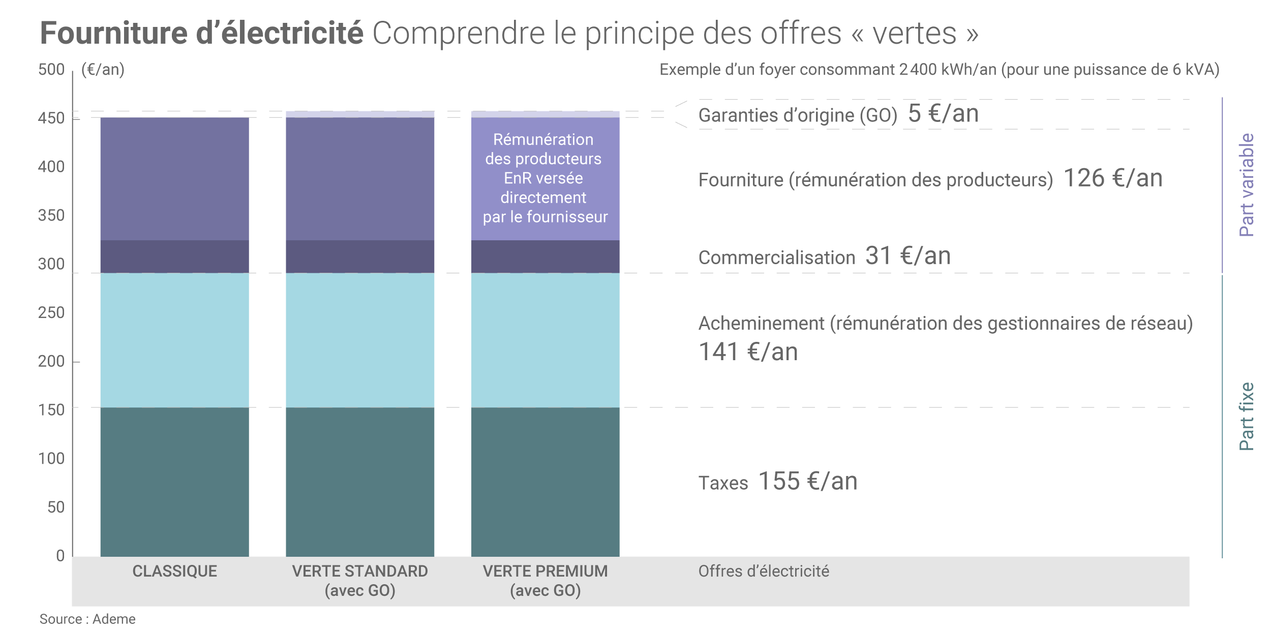 • dans le cas d’une offre verte « premium », le fournisseur achète de l’électricité et des GO directement auprès des producteurs EnR en signant avec eux des contrats d’achat. L’Ademe mentionne dans sa publication 3 fournisseurs proposant une offre d’électricité verte « premium » en France (Enercoop, Ilek et Energie d’ici(4)) auxquels s’ajoute ekWateur.