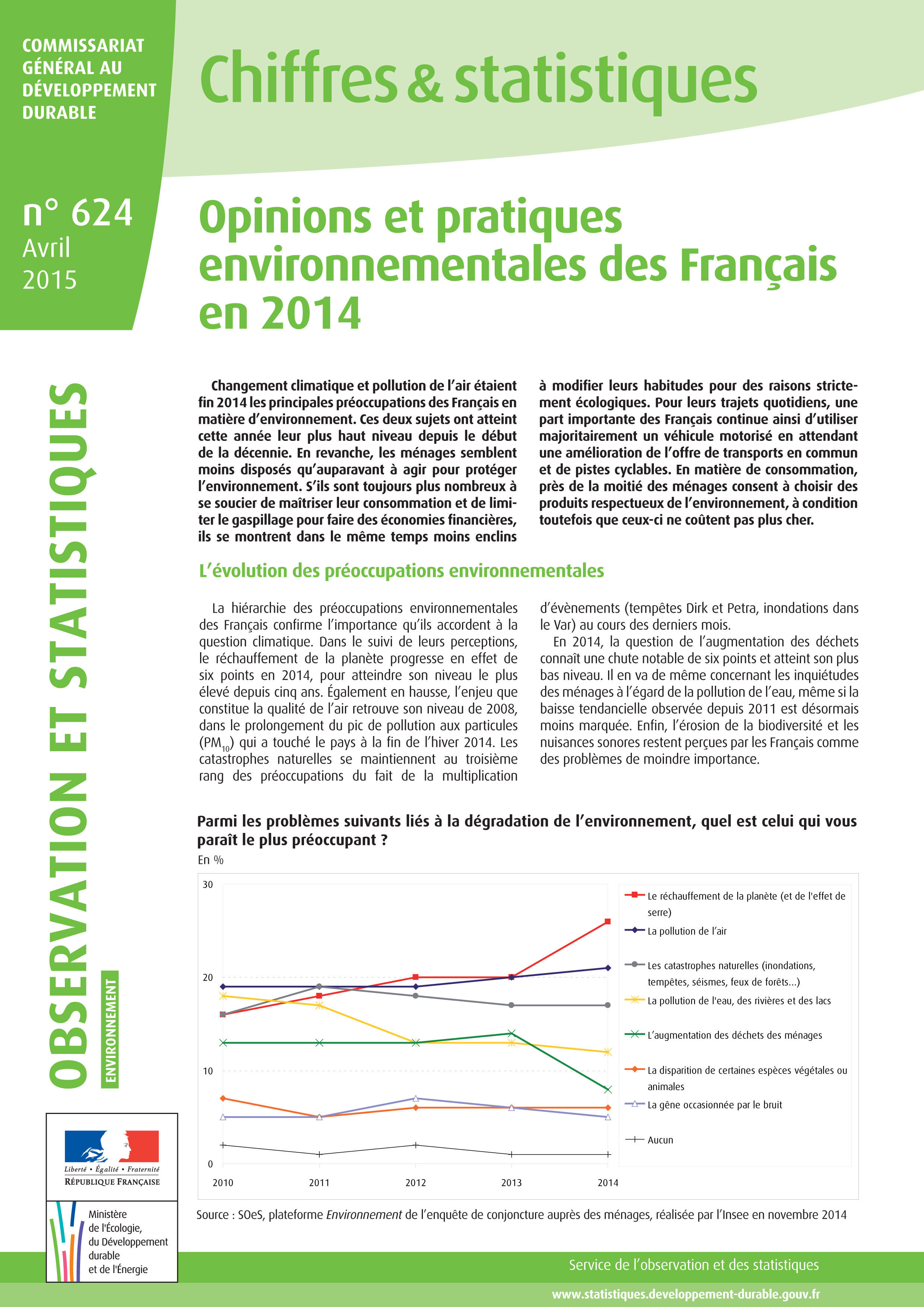 En tête des préoccupations environnementales des Français figure le réchauffement de la planète devant la pollution de l’air, une problématique plus sensible depuis le pic de pollution aux particules fines à la fin de l’hiver dernier. Au quotidien, les personnes interrogées citent plus prosaïquement le bruit et le manque de transports en commun parmi les principaux problèmes à l’échelle de leur quartier (avec la pollution de l’air en 3e position, problématique qui a le plus progressé entre 2013 et 2014).