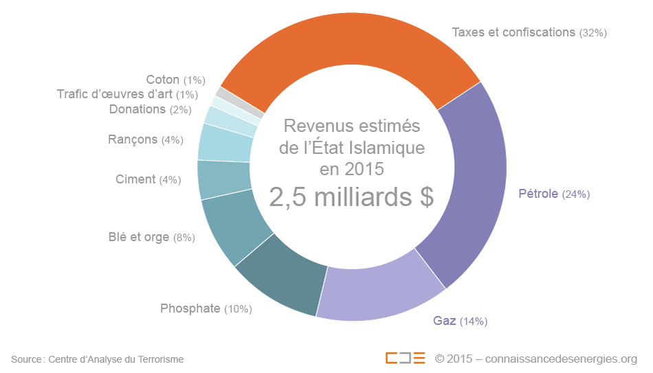 L’Etat Islamique a notamment compensé sa perte de revenus liés au pétrole par les impôts prélevés sur les populations sous son contrôle. (©Connaissance des Énergies d’après données du CAT)