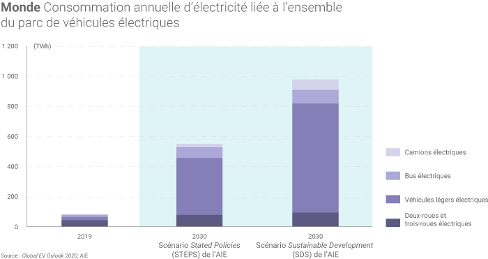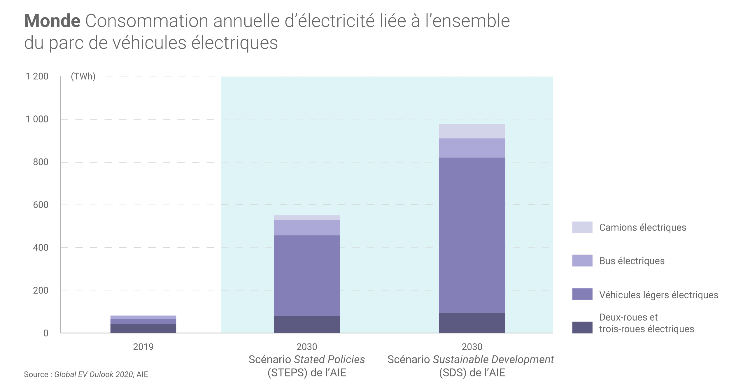 En incluant également les deux-roues et trois-roues électriques, l’AIE estime qu’à l’horizon 2030, la mobilité électrique pourrait, au niveau mondial, consommer annuellement entre 550 TWh (soit six fois le niveau de 2019) et presque 1 000 TWh (soit près de deux fois la consommation totale d’électricité en France en 2019).