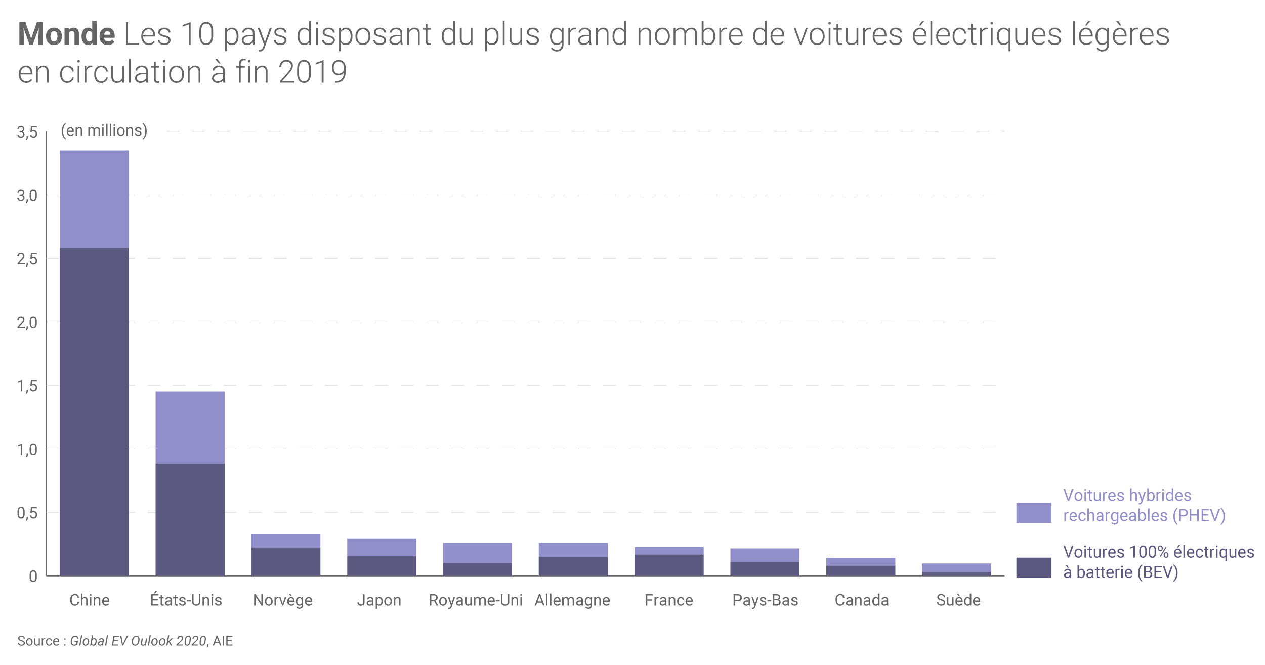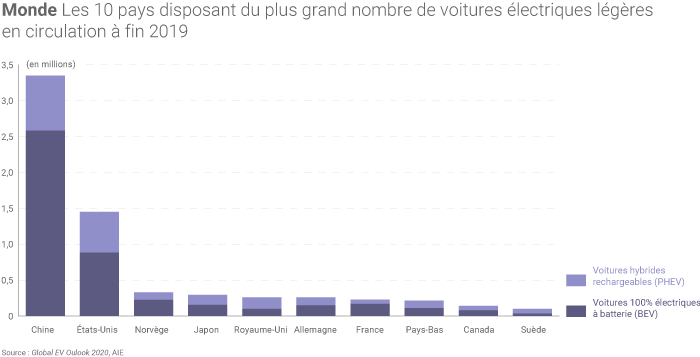 La Chine a compté à elle seule pour près de 47% des ventes mondiales de véhicules électriques légers en 2019. Plus de 3,3 millions de véhicules électriques légers circulaient dans ce pays à fin 2019. Huit autres pays disposent d’un parc de plus de 100 000 voitures électriques en circulation (par ordre d’importance) : les États-Unis, la Norvège, le Japon, le Royaume-Uni, l’Allemagne, la France, les Pays-Bas et le Canada.