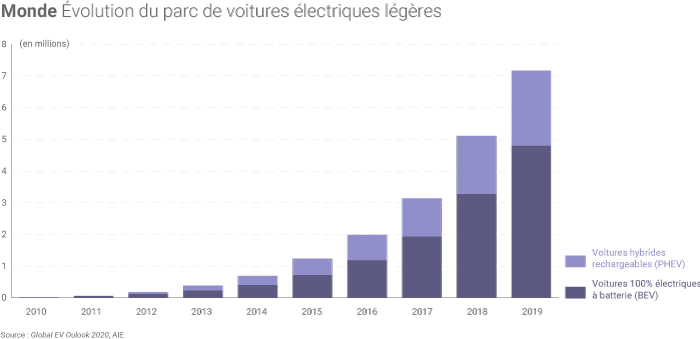 Près de 2,1 millions de voitures électriques légères (en incluant modèles 100% électriques à batterie et modèles hybrides rechargeables) ont été vendues dans le monde en 2019, portant leur parc à 7,2 millions de véhicules selon l’AIE. Le nombre de voitures électriques en circulation sur ce segment (véhicules légers) a ainsi augmenté de 40% au cours de l’année 2019.