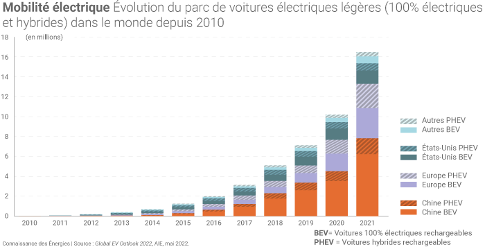 D’un point de vue géographique, la Chine joue toujours un rôle central dans le développement des voitures électriques, ce pays ayant compté pour la moitié des ventes de ces véhicules en 2021 (3,3 millions, soit davantage que l’ensemble des ventes de voitures électriques dans le monde durant l’année 2020). Les deux autres gros marchés de l’électromobilité sont l’Europe (2,3 millions de voitures électriques vendues en 2021, soit 65% de plus qu’en 2020) et les États-Unis (630 000 ventes en 2021, en croissance après 2 années de baisse).