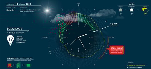 L’horloge peut par ailleurs être personnalisée avec la mise en place d’alertes de surconsommation, l'affichage du bilan des émissions de CO2 générées par la consommation énergétique du bâtiment ou encore de messages particuliers durant les heures auxquelles le « gisement d’économies » est important. L’objectif de l’horloge est ainsi de donner accès à des données complexes sous une forme tant ludique qu’esthétique. Le dispositif s’est d’ailleurs vu décerner un prix du design par l’APCI (Agence pour la Promotion de la Création Industrielle) en novembre 2012.