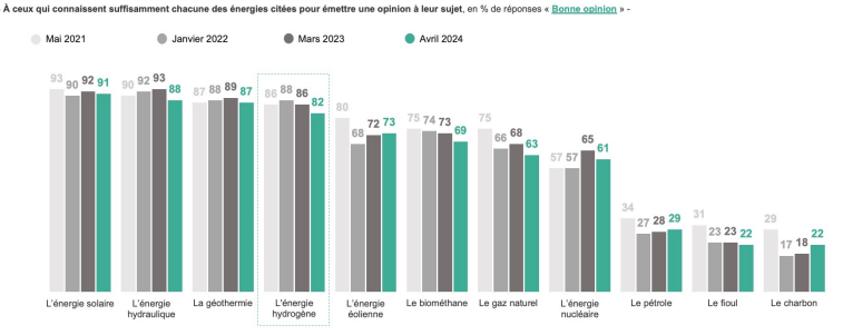 Parmi les publics « avertis » sur les questions énergétiques en France, l'hydrogène fait, avec le solaire, l'hydraulique et la géothermie, partie des sources ou vecteurs d'énergie ayant la meilleure image.